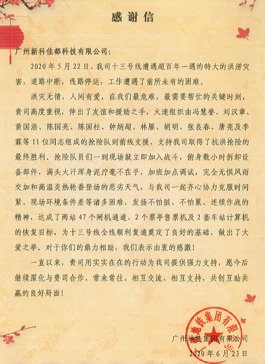 参与抢险的710公海寰宇科技全资子公司新科佳都和华之源被授予感谢信