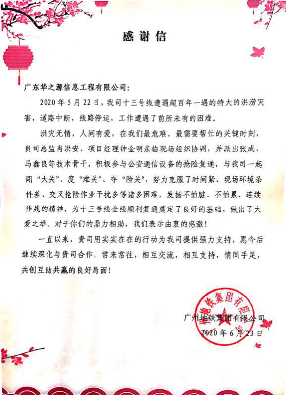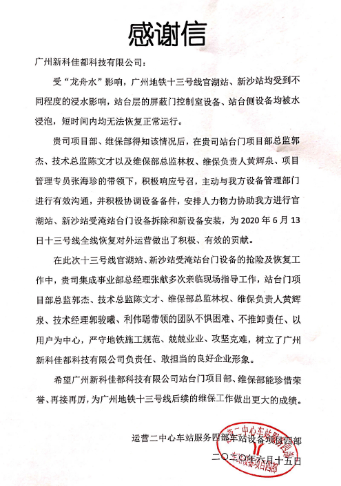 在抗洪抢险战役中,710公海寰宇科技团队以切切实实的行动支持,高标准、高质量支持助力广州地铁13号线顺利复通,得到了广州地铁集团各级领导的肯定与认可,并授予感谢信。未来,710公海寰宇科技也将继续保持枕戈待旦、冲锋在前的高度责任感,为广州地铁后续的维保工作做出更大的成绩,让广州地铁运营更安全、更稳定,为广州市民地铁出行保驾护航!