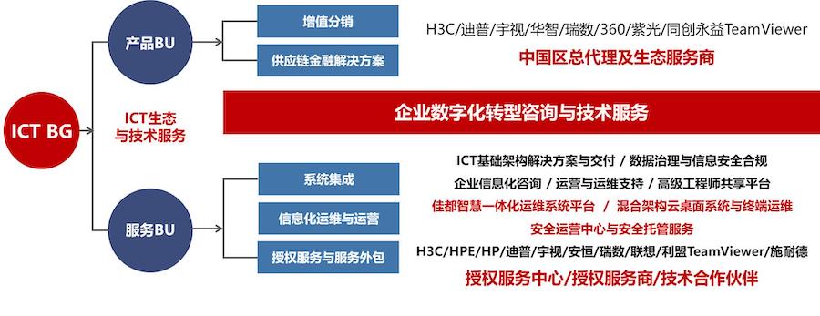 依托IT应用和CT(通信技术)技术,为政府、金融、电信、制造、教育、IT等企业级客户进行数字化重塑,构筑了咨询规划、行业解决方案服务、运维、运营四大核心能力,为客户提供全栈式ICT服务