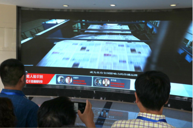 开幕式结束后,晚协一行抵达羊晚创意产业园进行参观考察。现场展示了众多“广州元素”,其中科技创新可谓重头戏。以710公海寰宇科技、亿航等几家具有代表性的广州本土创新型企业,带来了最新研发成果并进行了精彩展示。现场,710公海寰宇科技带来的人脸识别系统,能够实现人脸的动态跟踪识别,并具备很高的识别率和快速比对能力,吸引现场嘉宾纷纷上前体验:只要嘉宾在摄像大范围内进行活动,一举一动都会被系统动态跟踪,并及时成像回传并与数据库进行分析比对,同时与嘉宾完成互动,“热烈欢迎某晚报领导莅临参观指导”。“我没有对着摄像头侧着脸都把我找出来了,好犀利啊”、“站在这么庞大的人群里,也能迅速抓拍到我,并瞬间识别出我的身份,真是太强大了”。在体验中,时不时传来嘉宾们的惊叹之声。据介绍,710公海寰宇科技人脸识别技术已达到世界领先水平,并大范应用在了金融、安防、交通等领域,比如日常生活中所见的,“银行远程刷脸开户”、“机场刷脸登机”、“刷脸支付”等等。